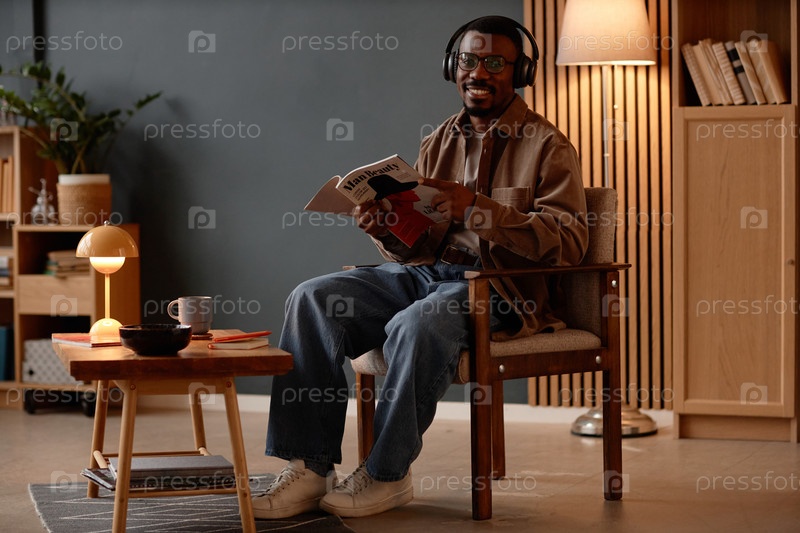 Улыбающийся чернокожий мужчина с наушниками читает журнал моды, сидя в кресле дома