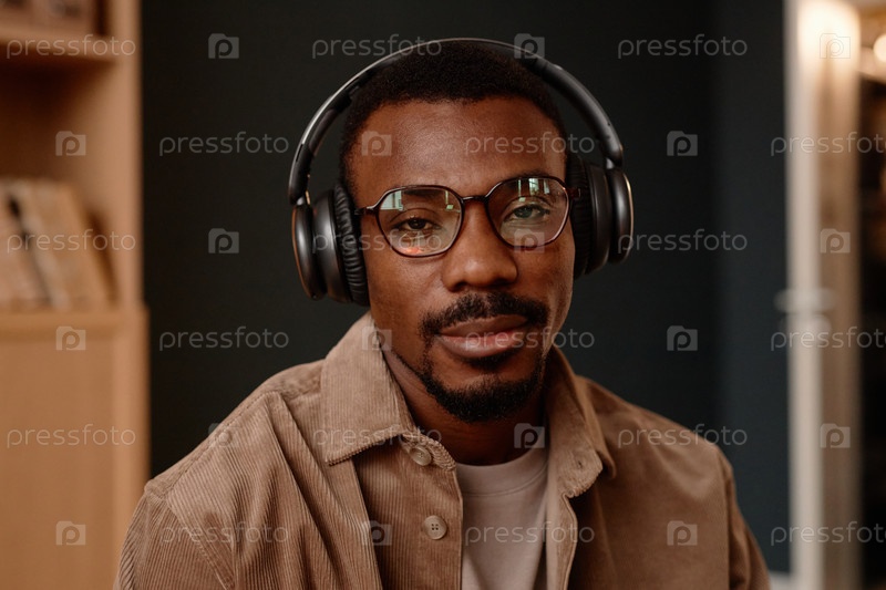 Портрет чернокожего человека с бородой, слушающего музыку через наушники в помещении