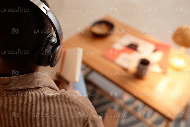 Черный мужчина слушает подкаст через беспроводные наушники дома
