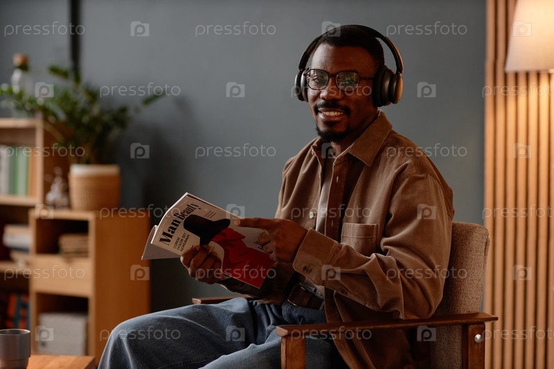 Портрет улыбающегося чернокожего мужчины с наушниками, читающего журнал моды в кресле дома