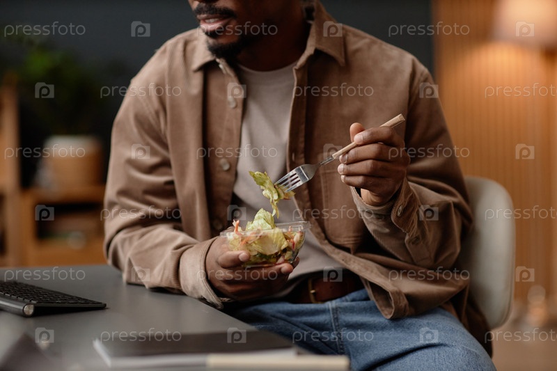 Чернокожий рабочий-мужчина ест салат, доставленный на рабочем месте, сидя за офисным столом