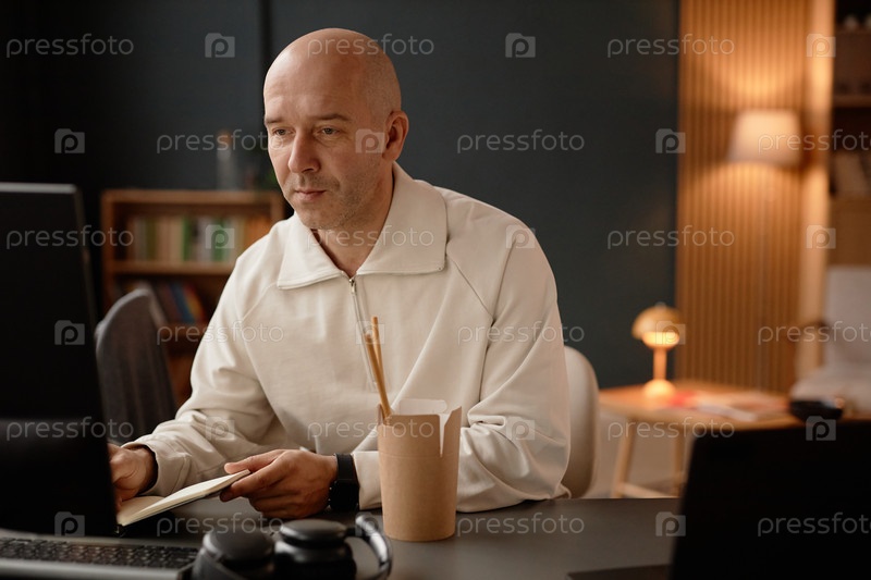 лысый мужчина, использующий компьютер за столом с коробкой на вынос Работает во время перерыва на обед в офисе