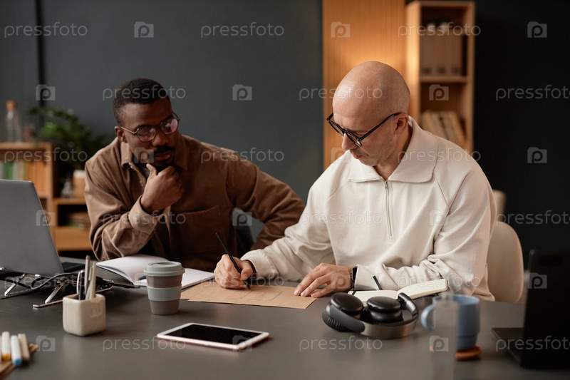 Лысый мужской дизайнер интерьера рисует эскиз, работая вместе с коллегой в офисе