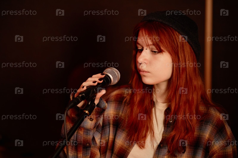Молодая женская вокалистка с пирсингом настраивает микрофон, когда поет песню в студии записи