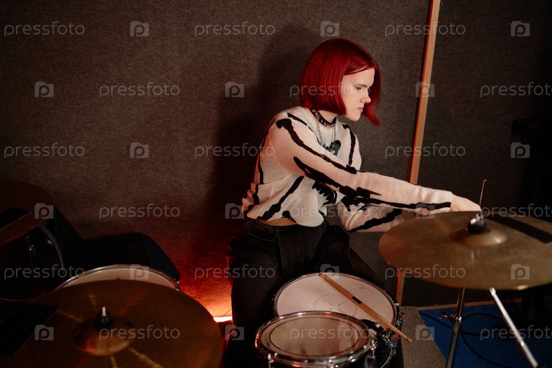 Молодая женщина-музыкант регулирует цимбалы, готовит барабаны и записывается в студии