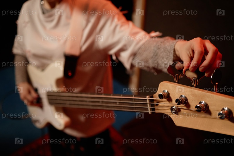 Рука женщины-музыканта, настраивающей тюнинговые петли при выборе бас-гитары в студии