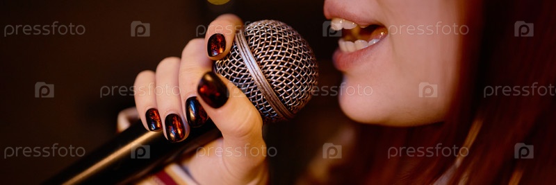 Header Image of Микрофон в руках молодой женской вокалистки, выступающей на сцене