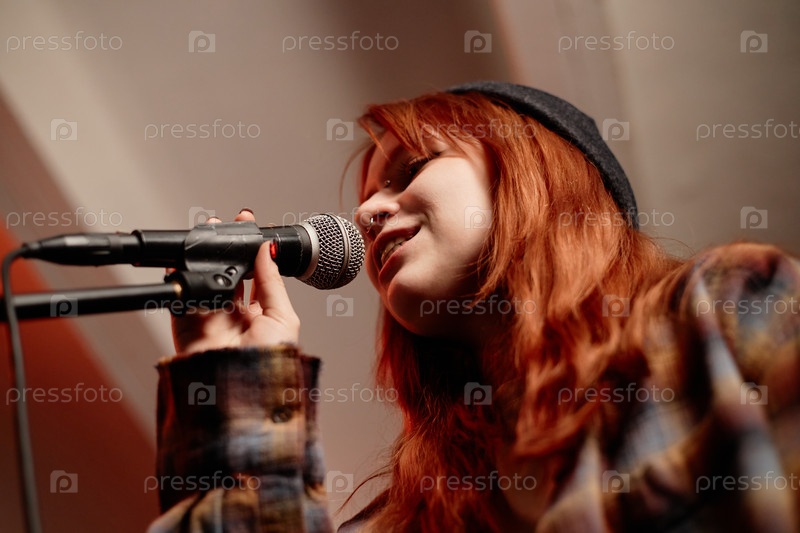 Молодая девушка поет песню в микрофон наслаждается игрой музыки с рок-группой в студии записи