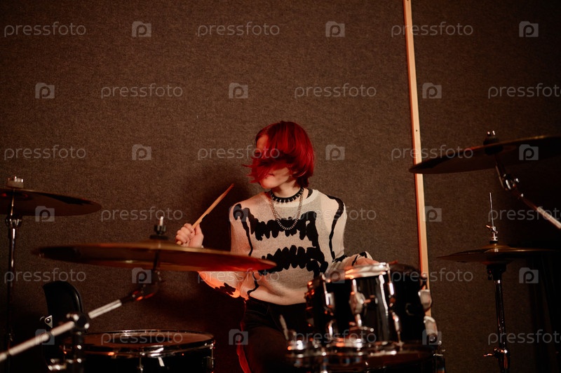 Тинейджерская артистка-женщина трясет волосы, играя на барабанах в студии записи