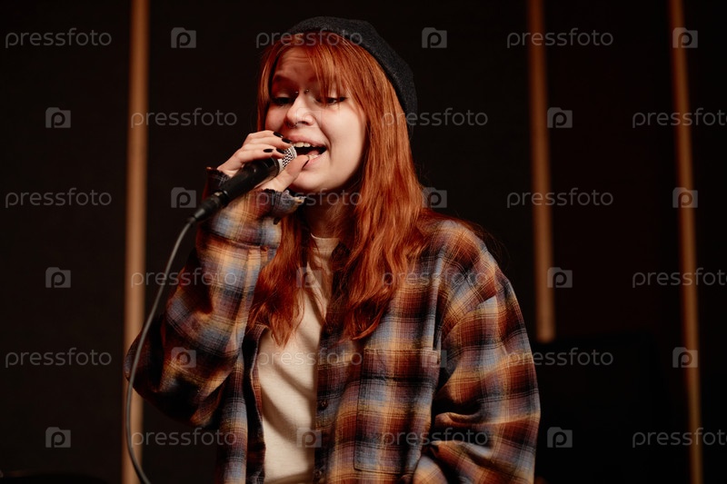 Подростковая девушка поет песню в микрофон во время концерта панк-музыкальной группы