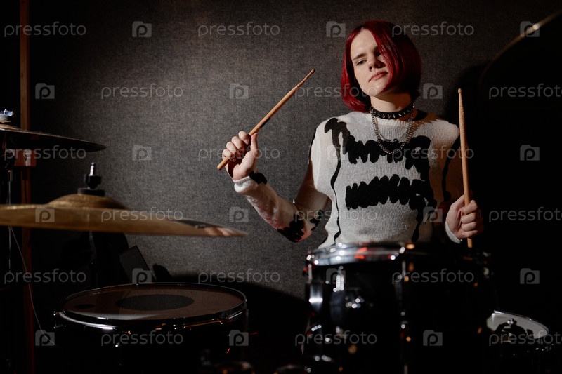 Подростковая девушка сосредоточилась на барабанной игре, исполняя панк-рок музыку в помещении