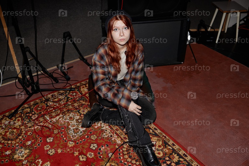 Подростковая певица смотрит на камеру, сидя с микрофоном на ковре в студии записи
