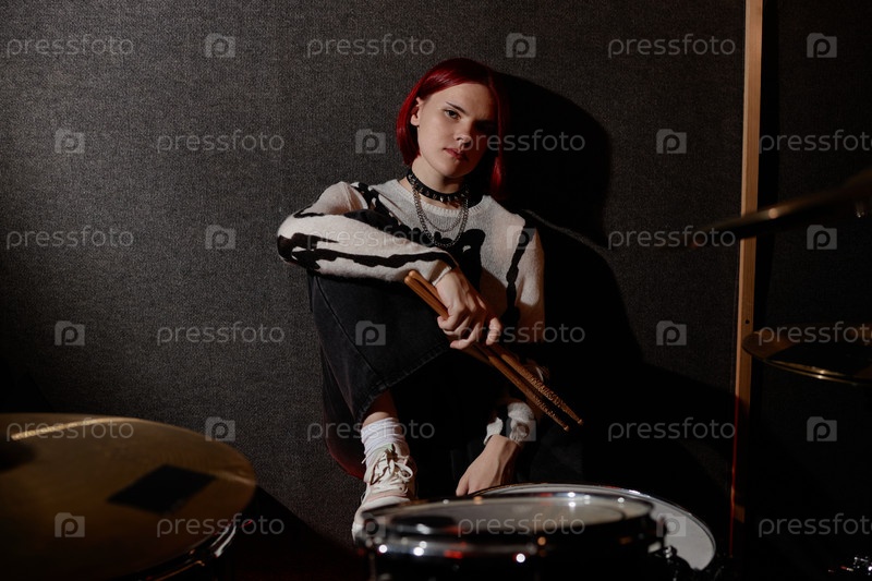 Подростковая женщина-барабанщица смотрит на камеру, сидящая за барабаном в студии