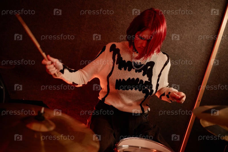 Подростковые девочки выразительно играют на барабанах, трясут волосы во время исполнения панк-рока в помещении