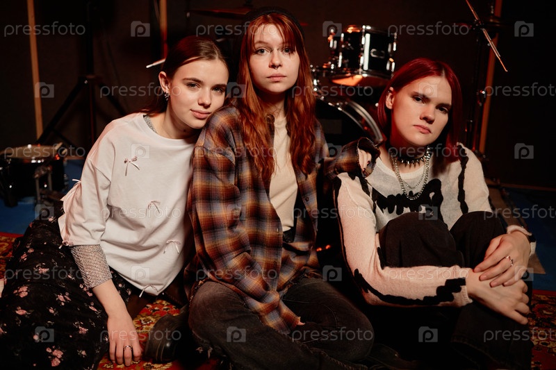 Портрет девочной группы, состоящей из трех молодых девушек, позирующих в студии записи
