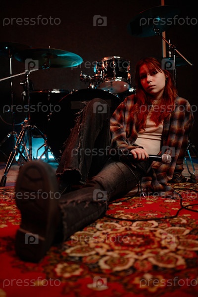 Молодая певица в старинной одежде позирует лежа на ковре в студии звукозаписи