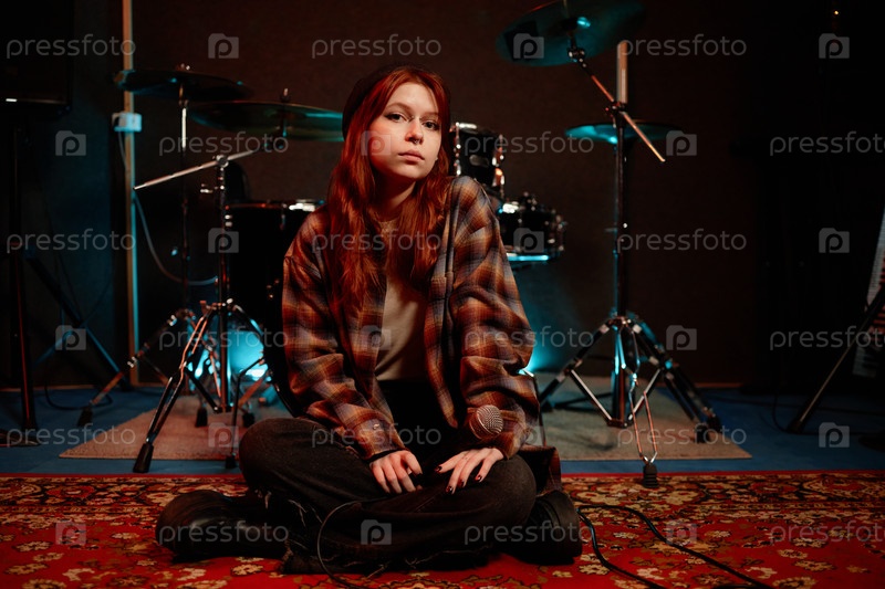 Вокалистка-подросток смотрит на камеру, сидя с микрофоном на полу в студии