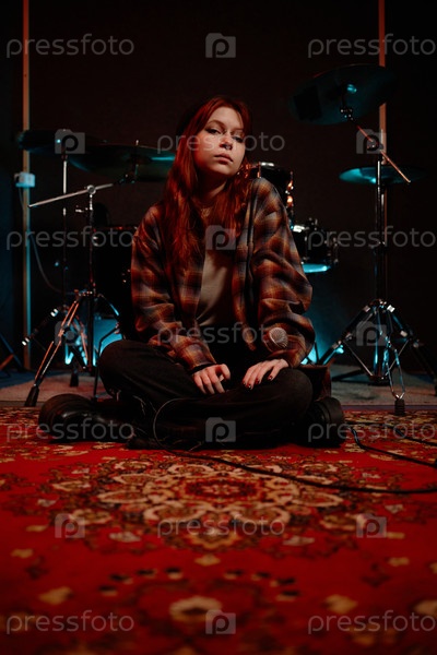 Певица-подросток смотрит на камеру, сидя с микрофоном на ковре в студии