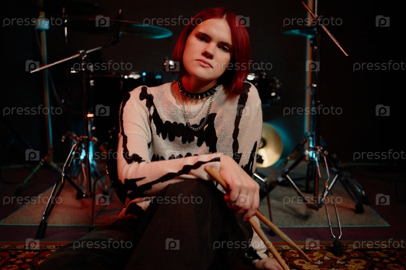 Портрет женщины-барабанщицы, сидящей на полу рядом с барабанами в студии