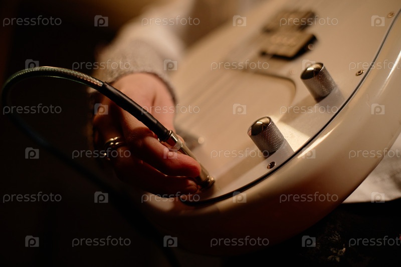 Рука женщины, соединяющей кабельный джек с бас-гитарой Подготовка инструмента для гитары в студии