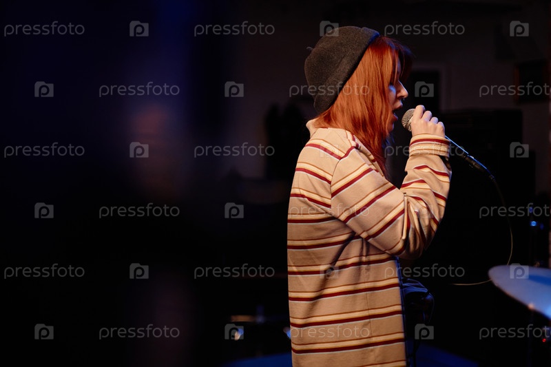 Подростковая женская панк-вокалистка поет песню в микрофон под светом внимания в студии записи