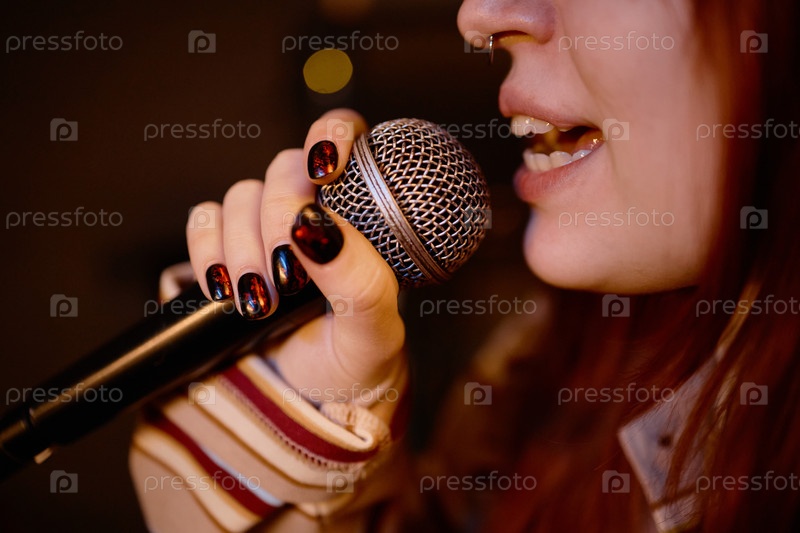 Микрофон в руках молодой женской вокалистки, выступающей на сцене