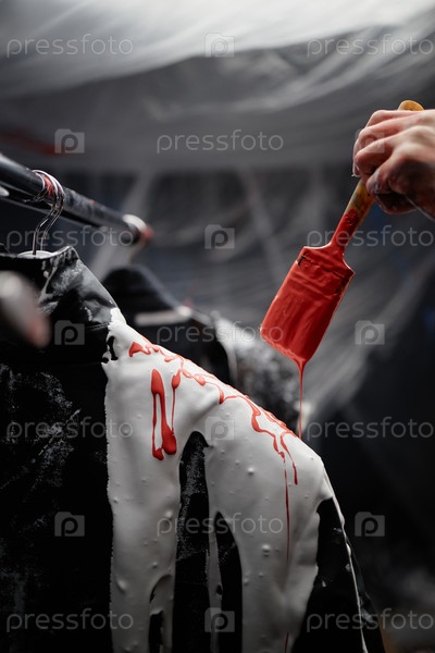 Кисть в руке мужчины качает красную краску на куртку окрашивая ткани внутри