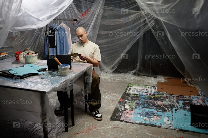 Мужчина-модный художник, изготавливающий на столе в мастерской с крашеным картонным покрытием на полу