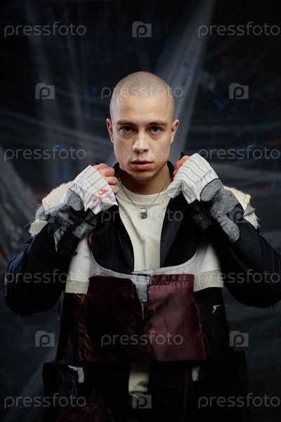 Портрет мужского модного дизайнера, носящего пластыревую куртку и позирующего в студии