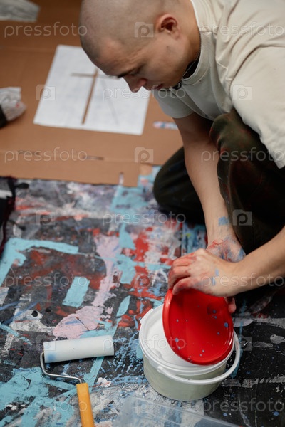 Художник открывает ведро с белой краской Мужчина рисует печать на одежде в мастерской