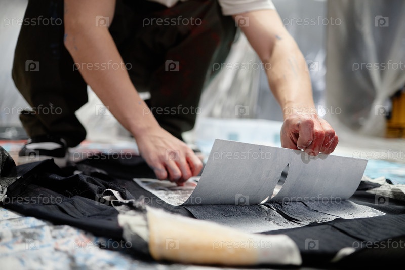 Мужчина-художник, удаляющий образец штенцера из ткани Рисование печати на одежде в мастерской внутри