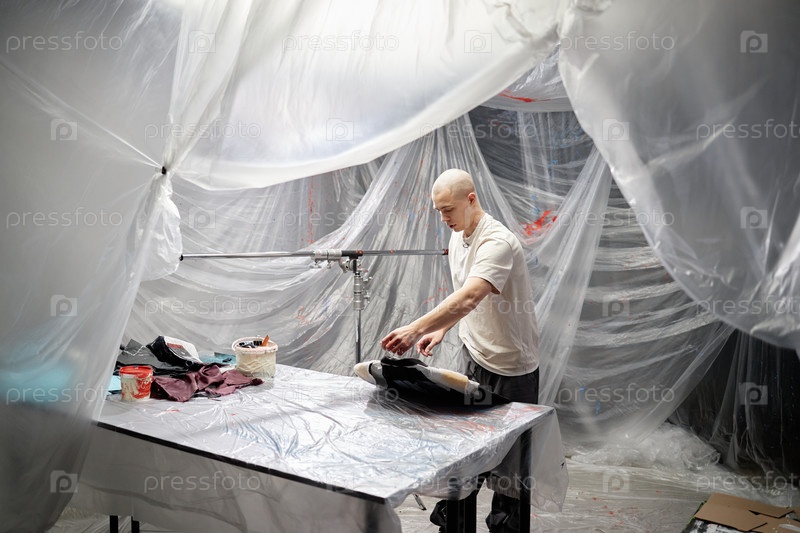 Модный дизайнер кладет куртку на стол, готовит краску на ткани в помещении Мужчина