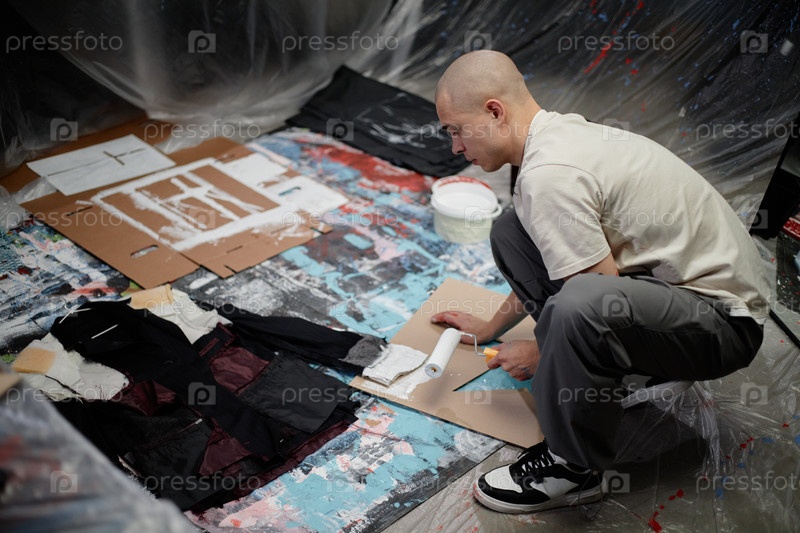 Мужской художник рисует переработанную куртку с белым цветом, создавая уникальный дизайн в мастерской