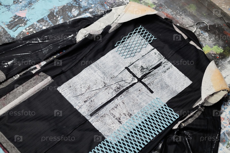 Дизайнерская куртка с крестообразным печатью, созданной из ткани краски, размещенной на полу мастерской