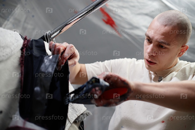 Лысый мужской художник, фиксирующий с помощью стрип-гуна подробности по индивидуальной одежде в мастерской