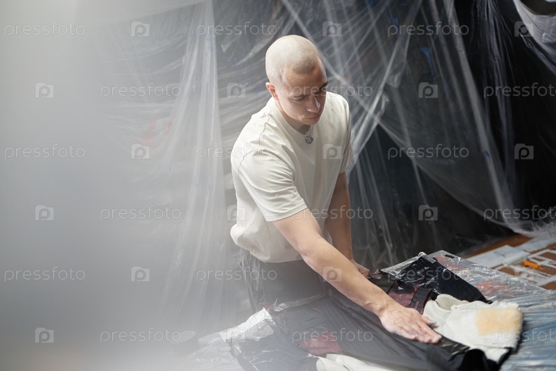 Мужчина-модный художник наносит клейкую ленту на куртку, рисуя ткань на столе в мастерской