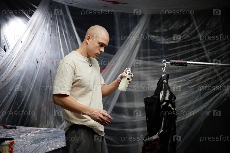 Художник распыляет белую краску на цветную ткань куртки, создавая дизайн моды в помещении