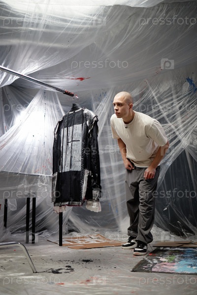 Модный дизайнер, работающий над пластырем Мужской пиджак с окрашенным печатью в помещении