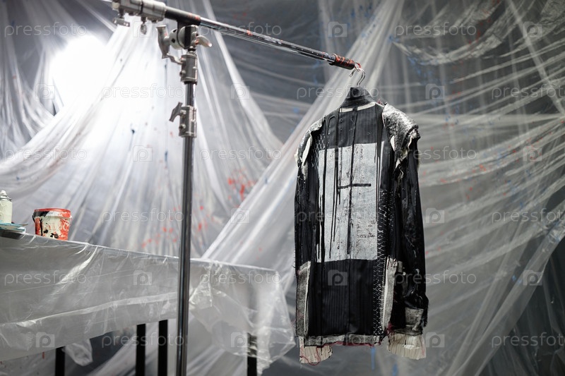 Upcycled Grunge Jacket with Painted Print Hanging in Workshop Indoors (Восстановленная грандж куртка с окрашенным принтом, висящая в мастерской внутри дома)