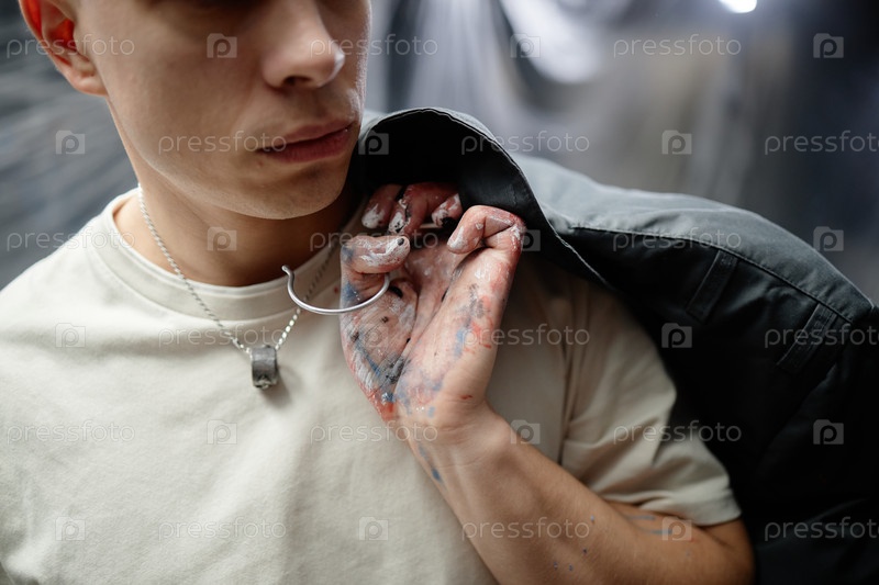 Мальчики-модные художники рукой закрашены краской, держа в кармане куртку во время окраски одежды на мастерской
