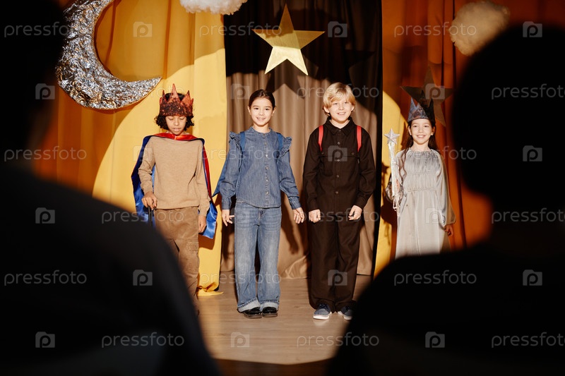 Выступление детей, стоящих на сцене во время школьной пьесы