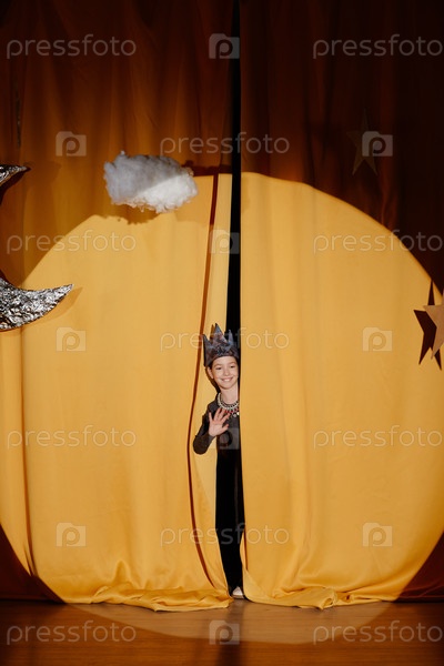 Ребенок в костюме заглядывает из-за сцены Занавес улыбается