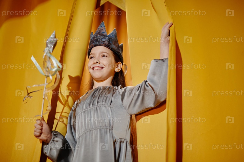 Улыбающаяся девушка, одетая в корону принцессы и держащая палочку