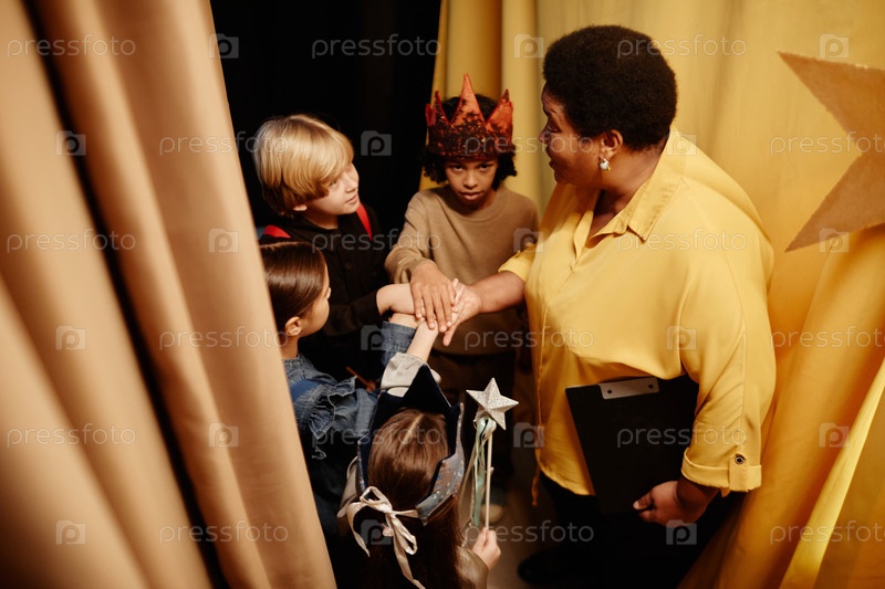 Педагог, участвующий с детьми во время репетиции школьной пьесы