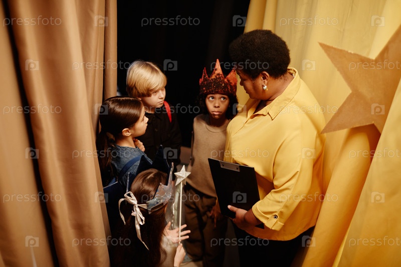 Дети готовятся к постановке на сцене За кулисами вместе с учителем