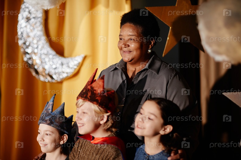 Улыбающаяся учительница со студентами на сцене в костюмах