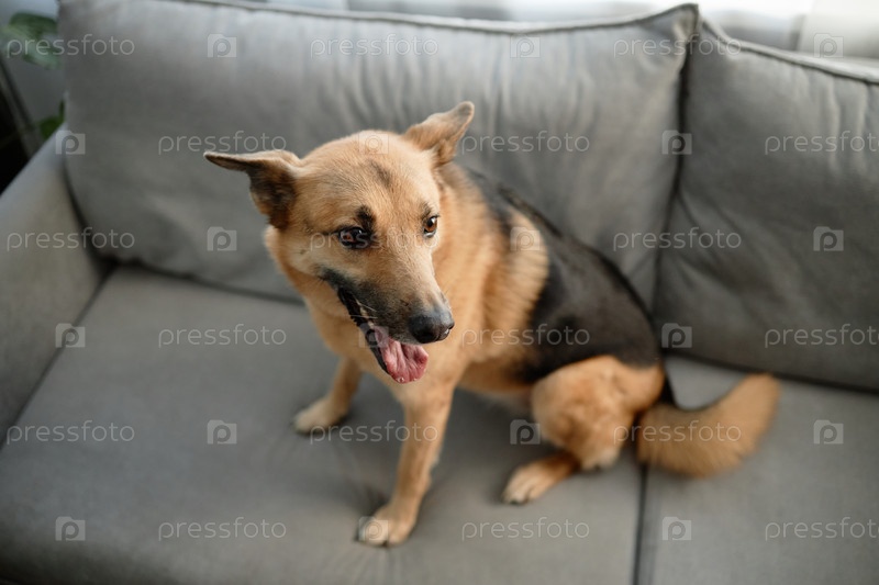 Сидящая немецкая овчарка на сером диване с вытянутым языком