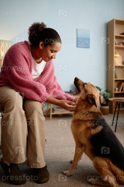Женщина, сидящая на диване и ласкающая немецкого овчарка