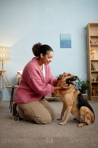 Улыбающаяся женщина на коленях и ласкает свою немецкую овчарку