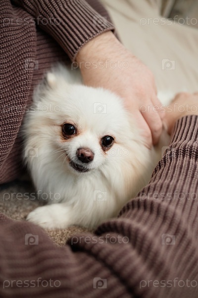 Человек, ласкающий маленькую белую собаку-помераньян в помещении